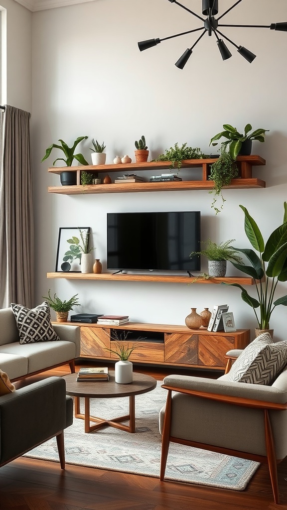 By using reclaimed wood, these shelves provide an eco-friendly option that adds warmth and character. The mix of plants and decorative items offers a personal flair, making it easy to customize for any home.