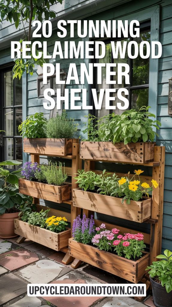 The image showcases a charming arrangement of reclaimed wood planter shelves. These shelves bring a cozy, rustic feel to any garden space. The weathered wood adds character, blending beautifully with the vibrant plants.
