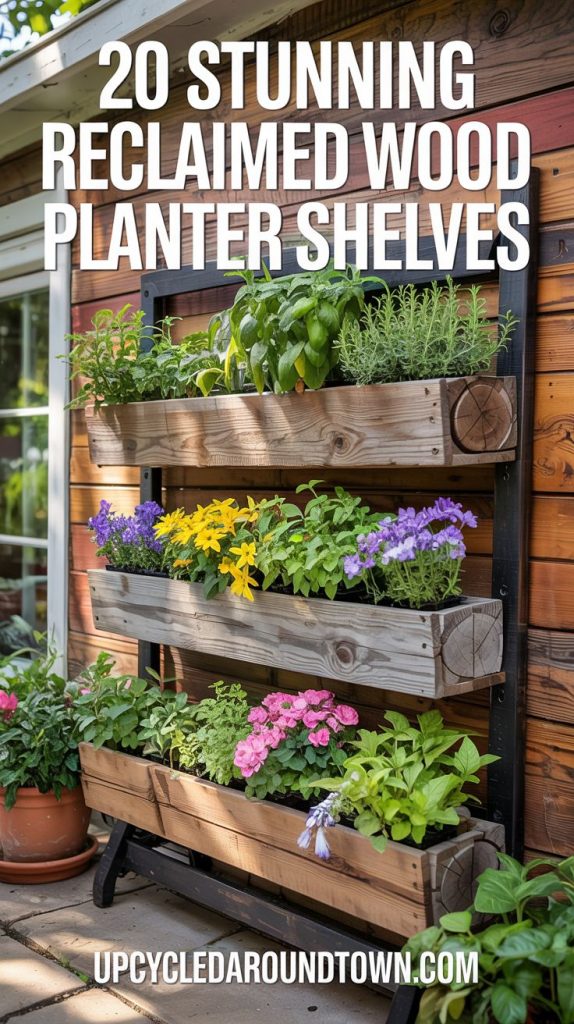 Reclaimed wood shelves are not just functional; they bring a unique charm to any space. The image showcases a variety of reclaimed wood planter shelves, each with its own character. The warm tones of the wood combined with the greenery from the potted plants create a welcoming vibe.